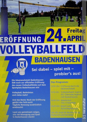 Die Ideenwerkstatt Badenhausen lädt am Freitag, 24. April, ab 15 Uhr zur Eröffnung des neuen Volleyballfeldes auf den Sportplatz Badenhausen ein. Nach der Eröffnung findet um 15.15 Uhr ein erstes Volleyballspiel Jugend SFC Osterode gegen Jugendcafé Badenhausen auf dem Programm. Um 16 Uhr gibt es Badminton mit der TSG und Freiwilligen. Um 16.30 können dann alle mitmachen. Der Vfl wird für die Bewirtung sorgen mit Getränken und Bratwurst. hn