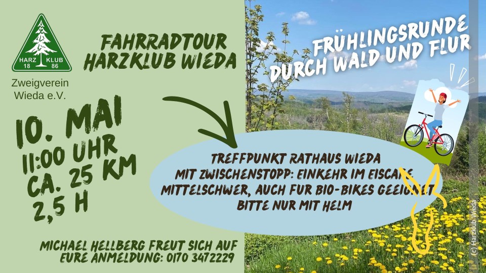 Fahrradtour mit dem Harzklub Wieda „Frühlingsrunde durch Wald und Flur“ - Mi., 13.05.2026, 15:00 - 18:00 Uhr, Lerbach